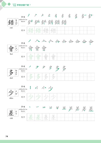 Lección 10 學華語難不難? അන orden de los ፹ 錯 trazos cuò ᄳο ፹ ፹ 錯 錯 അන orden de los ึ 會 trazos huì ᄳο ึ ึ 會 會 അන orden de los ε 多 trazos duō ᄳο ε ε 多 多 അන orden de los ˇ 少 trazos shǎo ᄳο ˇ ˇ 少 少 അන orden de los ࢨ 差 trazos chā ᄳο ࢨ ࢨ 差 差 74