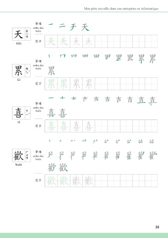 Mon père travaille dans une entreprise en informatique അන ordre des ˂ 天 traits tiān ᄳο ˂ ˂ 天 天 അන ordre des ଢ଼ 累 traits lèi ᄳο ଢ଼ ଢ଼ 累 累 അන ordre des ః 喜 traits xǐ ᄳο ః ః 喜 喜 ᛇ 歡 ordre des അන traits huān ᛇ ᛇ 歡 歡 ᄳο 25