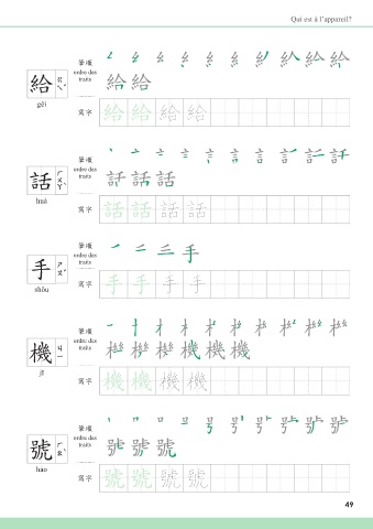 Qui est à l’appareil? അන ordre des ഗ 給 traits gěi ᄳο ഗ ഗ 給 給 അන ordre des ༑ 話 traits huà ᄳο ༑ ༑ 話 話 അන ordre des ˓ 手 traits ᄳο ˓ ˓ 手 手 shǒu അන ordre des ዚ 機 traits jī ᄳο ዚ ዚ 機 機 അන ordre des 號 traits hào ᄳο 號 號 49