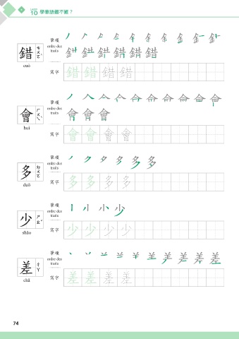 Leçon 10 學華語難不難? അන ordre des ፹ 錯 traits cuò ᄳο ፹ ፹ 錯 錯 അන ordre des ึ 會 traits huì ᄳο ึ ึ 會 會 അන ordre des ε 多 traits duō ᄳο ε ε 多 多 അන ordre des ˇ 少 traits shǎo ᄳο ˇ ˇ 少 少 അන ordre des ࢨ 差 traits chā ᄳο ࢨ ࢨ 差 差 74