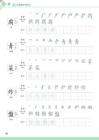 Leçon 03 紅燒魚非常好吃 അන ၵ 腐 ordre des traits fǔ ᄳο ၵ ၵ 腐 腐 അන ordre des ڡ 青 traits qīng ᄳο ڡ ڡ 青 青 അන ordre des ൄ 菜 traits cài ᄳο ൄ ൄ 菜 菜 അන ordre des ގ 札 traits zhá ᄳο ގ ގ 炸 炸 അන ordre des ᆵ 盤 traits pán ᄳο ᆵ ᆵ 盤 盤 22